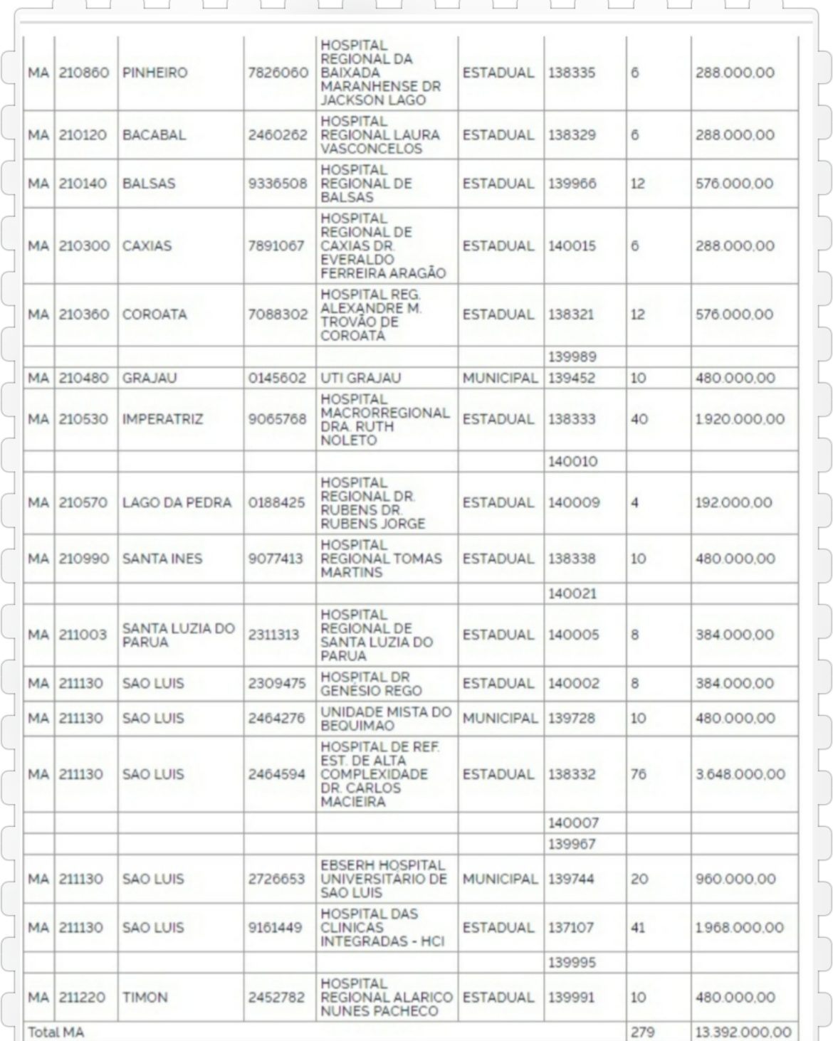O Ministério da Saúde confirmou liberou nesta sexta-feira, 19, mais R$ 13.392 milhões para o Maranhão. O recurso é para ser usado no custeio de 279 novos leitos de Unidades de Terapia Intensiva (UTI), para atendimento exclusivo de pacientes com Covid-19, em municípios maranhenses.