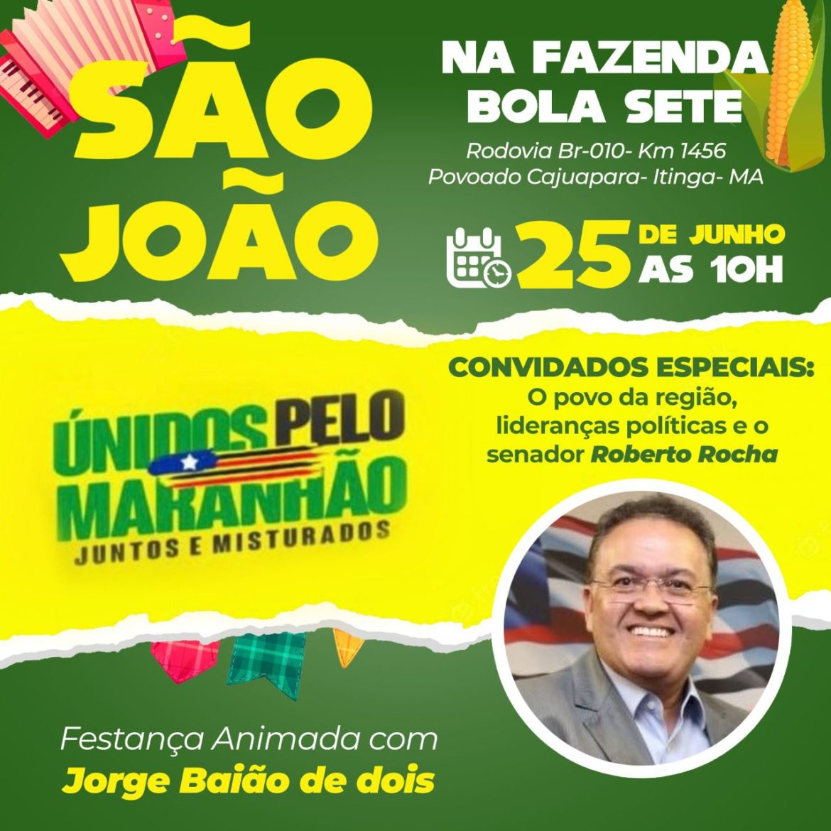 O senador Roberto Rocha (PTB-MA) estará, neste sábado, 25, no município de Itinga. Ele vai participar do grande arrail promovido pelo grupo Unidos Pelo Maranhão. A celebração vai acontecer na fazenda Bola Sete, de propriedade do ex-prefeito de Açailândia, Ildemar Gonçalves, maior personalidade política da região Sul do estado.
