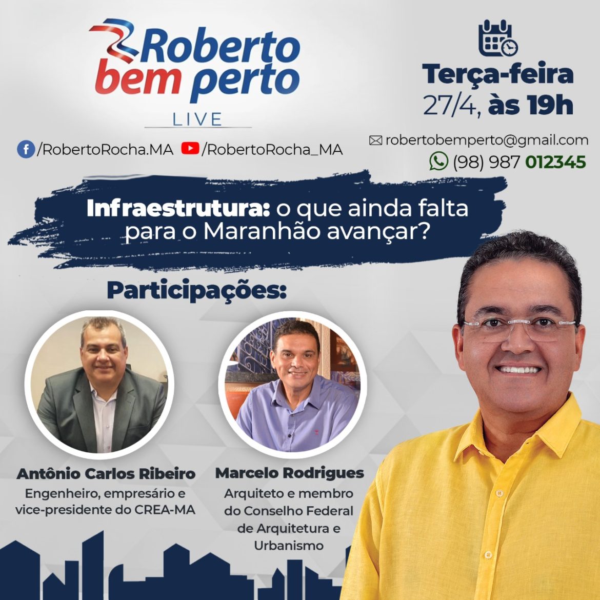 Infraestrutura: o que falta para o Maranhão avançar? Este é o tema da live “Roberto Bem Perto” que o senador Roberto Rocha vai realizar, nesta terça-feira, 27, à partir das 19h, em suas redes sociais (Facebook e YouTube).